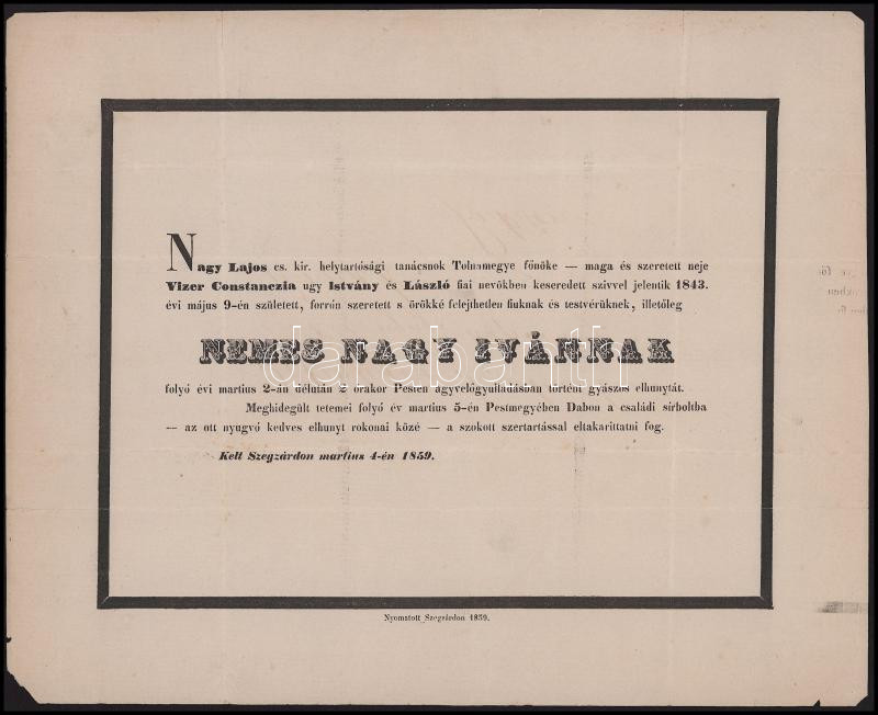 1859 Szekszárd, nemes Nagy Iván (1843-1859) halotti értesítője, kisebb lapszéli sérülésekkel, 23x28 cm