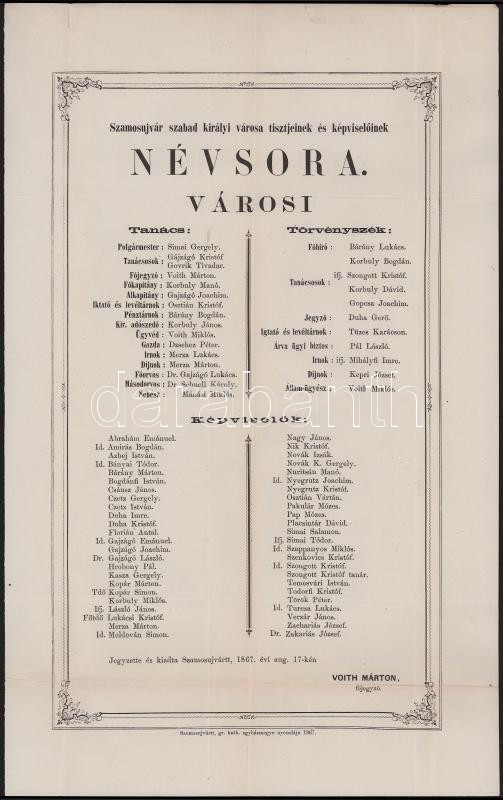 1867 Szamosújvár, Szamosújvár sz. kir. város tisztjeinek és képviselőinek névsora, hajtott, 42×26 cm