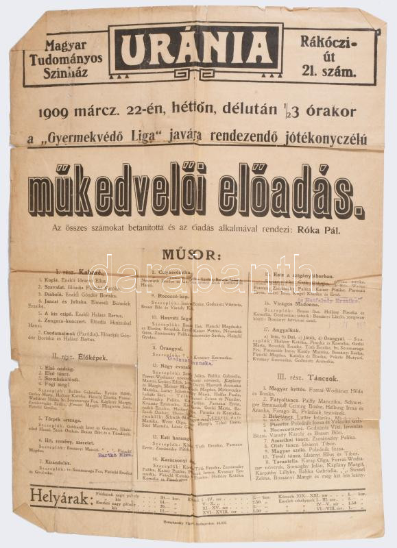 1909 Uránia, műkedvelő előadás plakát 32x44 cm Kissé sérült