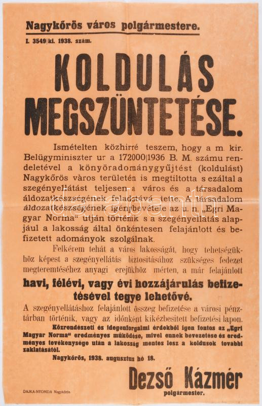 1938 Nagykőrös a koldulás betiltásáról szóló rendelet falragasz 32x37 cm