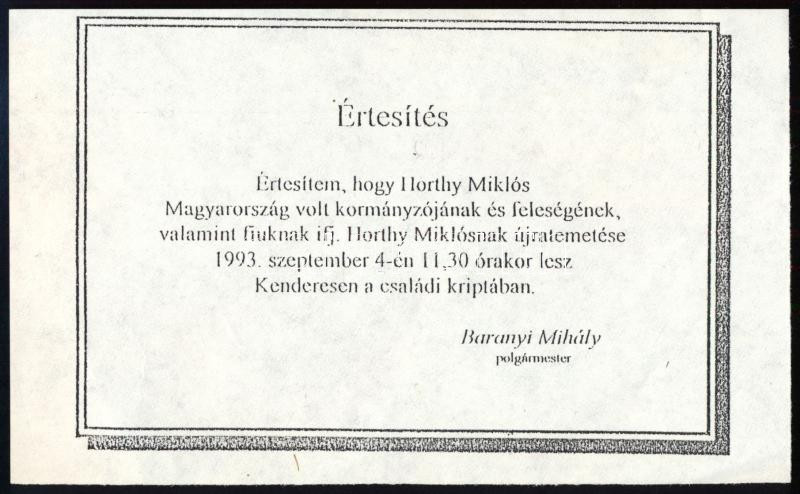 1993 Kenderes, értesítés Horthy Miklós kormányzó és családja újratemetéséről, 15x9 cm