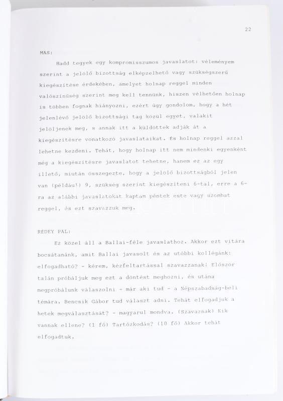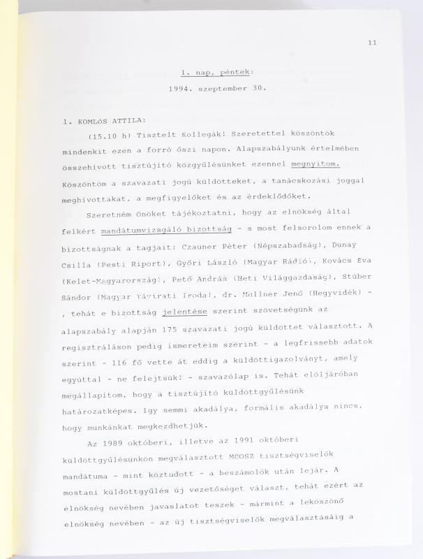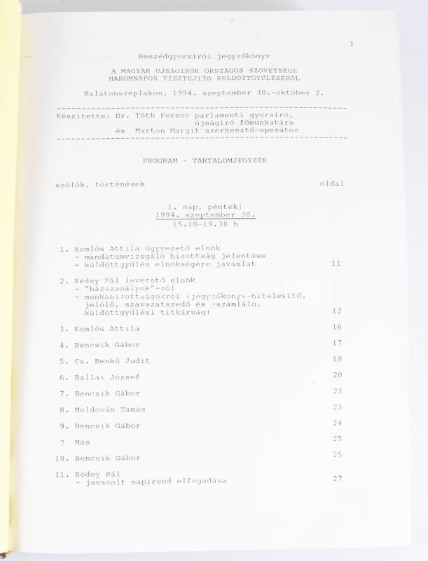 1994 BeszédgyorsÃrói jegyzÅ‘könyv a Magyar ÚjságÃrók Országos Szövetsége háromnapos tisztújÃtó küldöttgyűlésérÅ‘l Balatonszéplakon, 1994. szeptember 30. - október 2. Sztereografálta: Dr. Tóth Ferenc beszéd-gyorsÃró. Több mint 600 oldalon. MűbÅ‘r-kötésben, 30x21x8 cm.