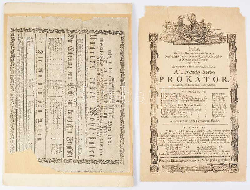 cca 1795 Német és magyar nyelvű színdarabot hirdető nyomtatvány (A házasságszerző prókátor, Ungarns erster Wohltäter), egyik papírra ragasztva