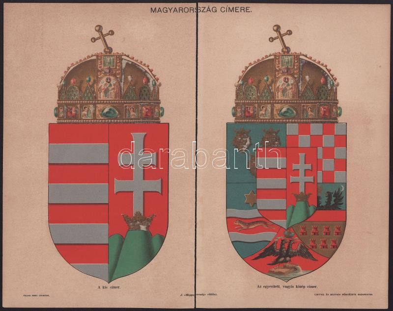 cca 1900 Magyar Nemzeti Kiscímer ésNagycímer Szent Koronával, kiadja: Czettel és Deutsch Műintézete a Pallas Nagy Lexikonához