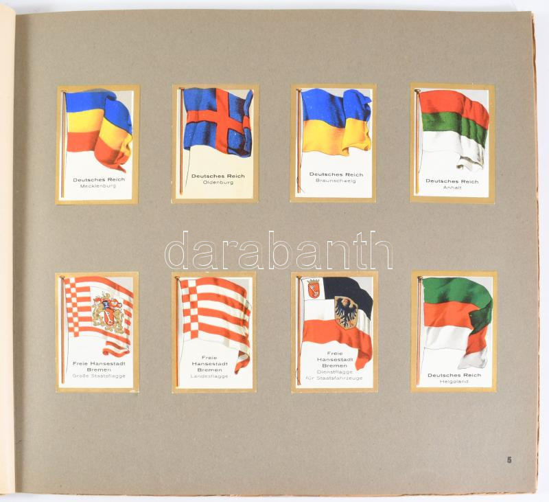 cca 1930 Die Flaggen Europas -Album 6. (Európai államok zászlóit tartalmazó cigarettakép gyűjtő album,2+27 t. Kiadói papírkötés, Komplett, kártyákkal, jó állapotban