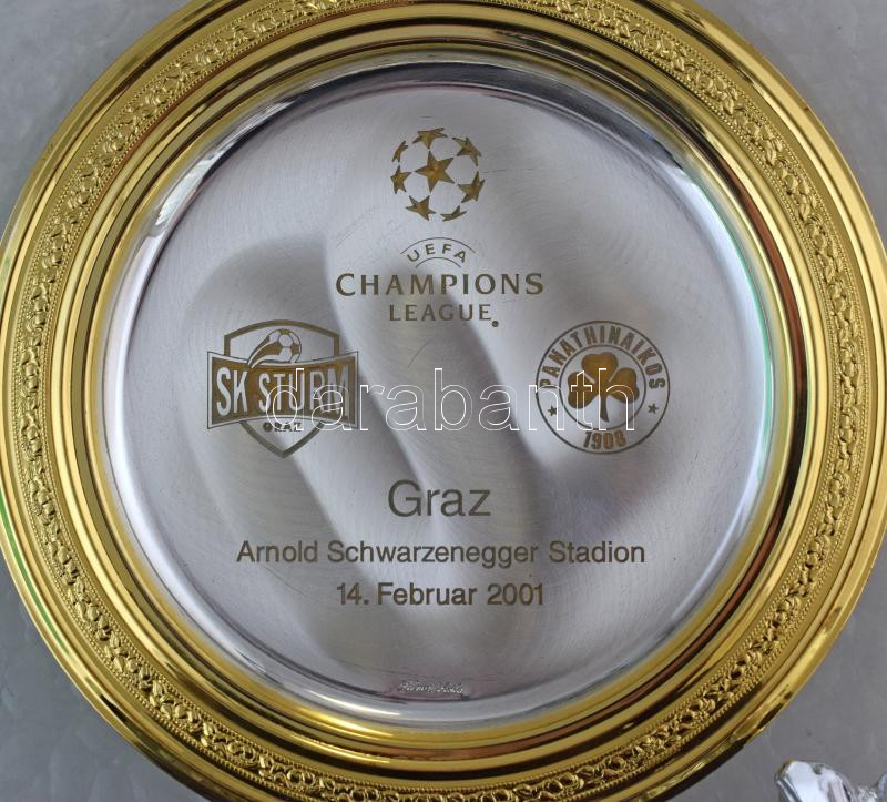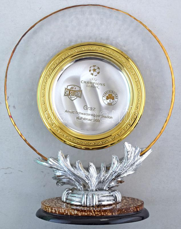 2001. műanyag, üveg és fém emléktárgy a 2001. február 14-én lejátszott SK Sturm Graz - Panathinaikos FC UEFA Bajnokok Ligája csoportkörös mérkőzésről. A grazi csapat a mérkőzést 2-0-ra megnyerte. Magyar érdekeltség is volt a találkozón, Korsós György végigjátszotta, Szabics Imre pedig csereként jutott szóhoz. ~34x28cm
