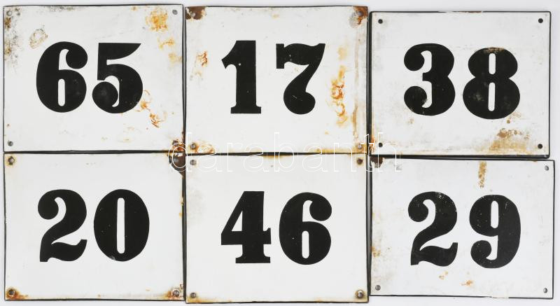 6 darab zománcozott házszámtábla, hibákkal, 15x17 cm