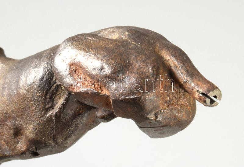 Antik vas kutya figura, farka végén felfogatóponttal, h: 14 cm