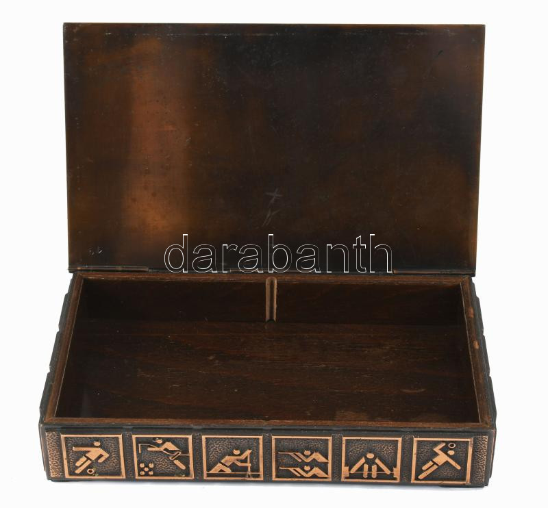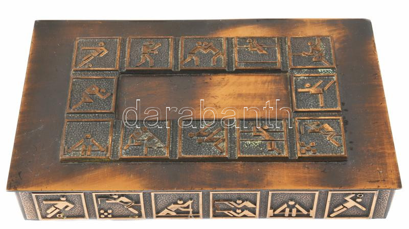 Díszdoboz, olimpiai sportágak ábrázolásával, hiányos fa betéttel, 12,5x20 cm