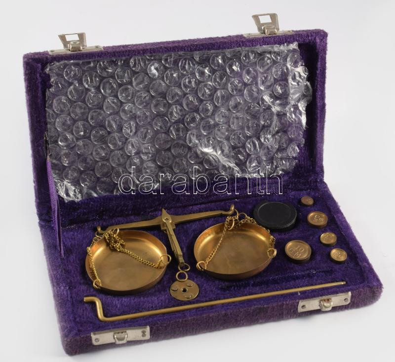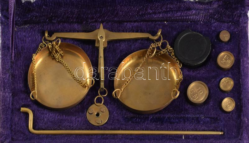 Egykaros ópiummérleg, réz súlyokkal dobozában.