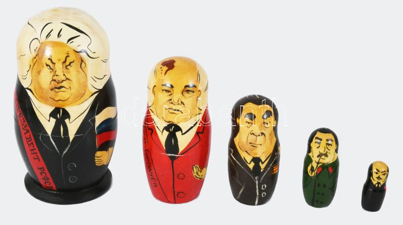 Jelcin, Gorbacsov, Brezsnyev, Sztálin, Lenin, stb. festett fa matrjoska babák 6 db 5-18 cm-ig