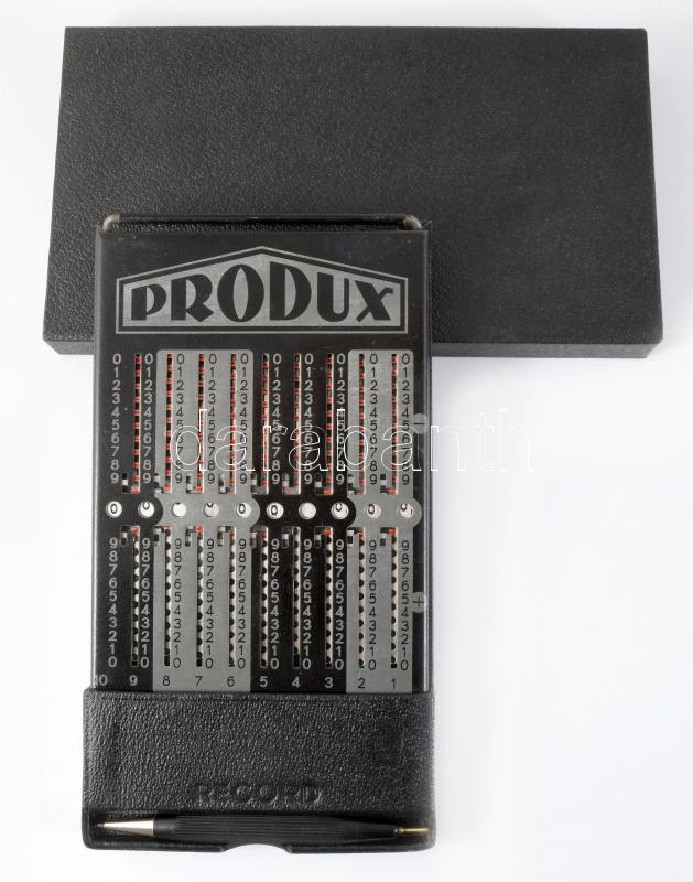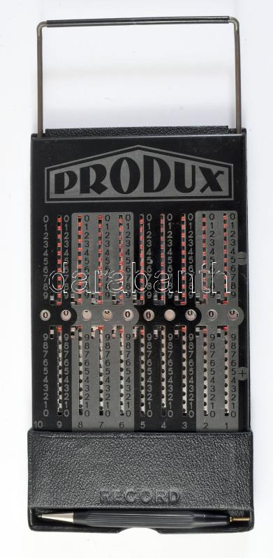 Produx márkájú mechanikus kézi számológép, eredeti tokban, tollal, szép állapotban 12x23 cm Eredeti tokkal, dobozzal.