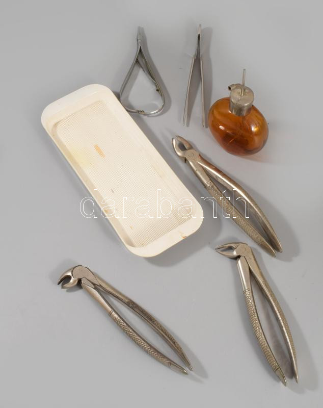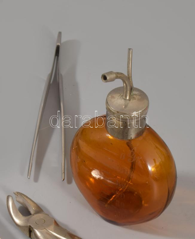 Régi fogorvosi szerszámok, közte ritka kloroform permetező palack.