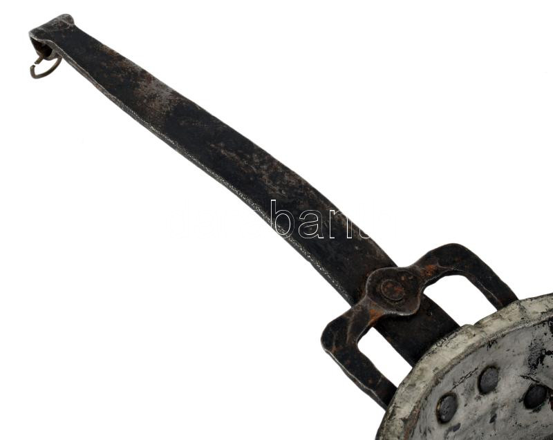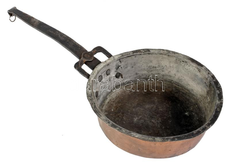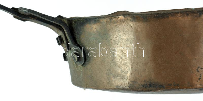Réz serpenyő vas fogóval. 19. sz, sérüléssel, h: 45 cm
