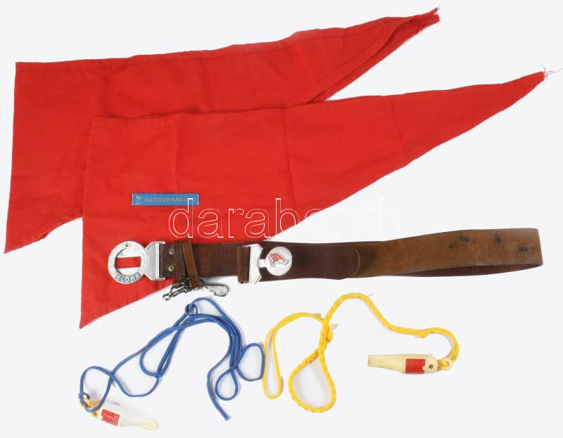 Úttörő felszerelés: öv csattal, kendő (2 db), síp (2db), "Kiváló kisdobos munkáért" fémlap