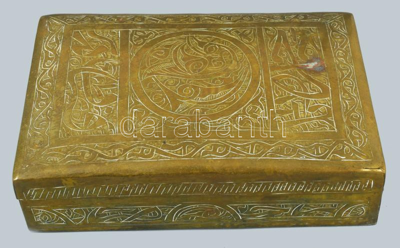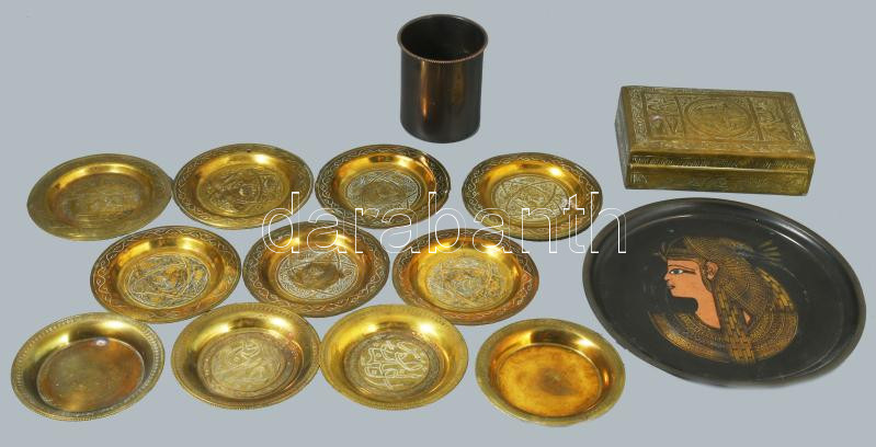 Vegyes réz tétel, egyiptomi fa béléses doboz 16 cm + egyéb tárgyak