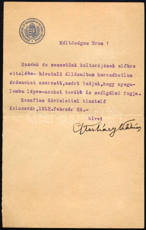 1912 Kolozsvár, gróf Esterházy Kálmán (1830-1916) politikus, országgyűlési képviselő, huszárhadnagy, Kolozs vármegye és Kolozsvár főispánja autográf aláírása gépelt levelén