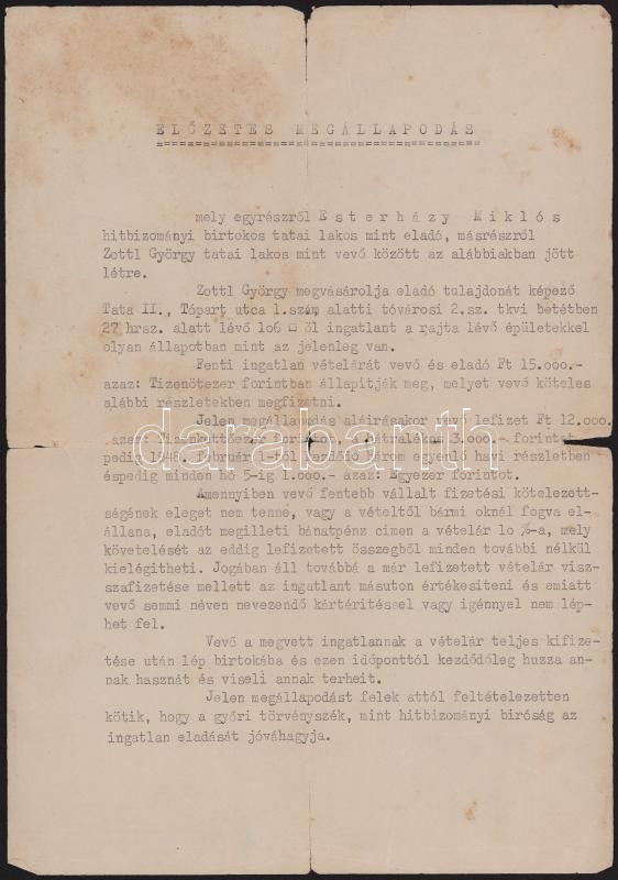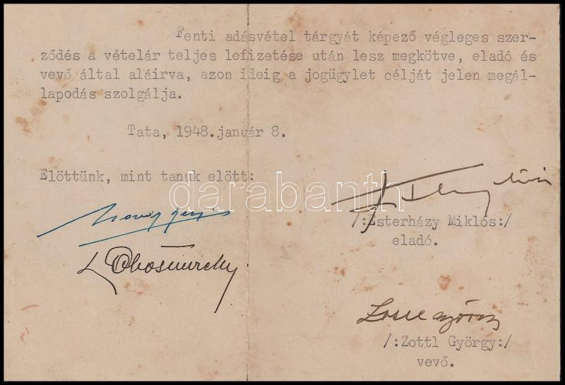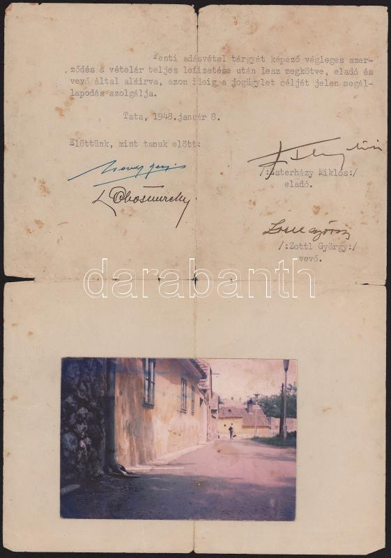 1948 Tata, galánthai gróf Esterházy Miklós (Esterházy Mária Ferenc Miklós) (1924-2004) aláírása Tópart utca 1. szám alatti ingatlanának eladásáról szóló szerződésen (a vevő Zottl György órás), kissé foltos, sérült + az ingatlan egy részletét ábrázoló fotó