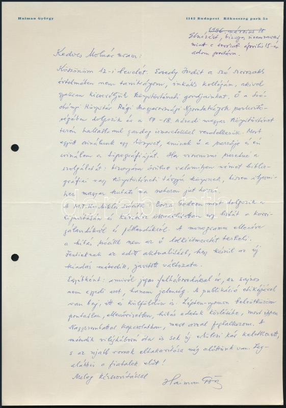 1996 Bp., Haimann György tipográfus, könyvművész kézzel írt levele