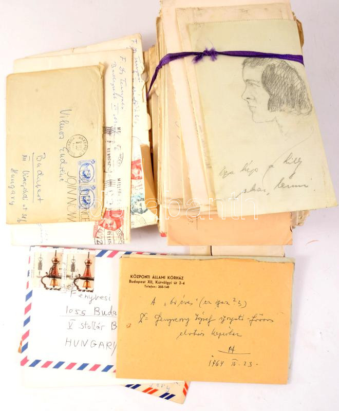 ca 1910-1940 Nagy doboznyi szerelmes levél, levelezés, szalaggal átkötve