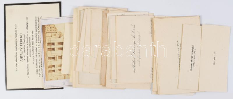cca 1870-1960 Vegyes névjegykártyák, egy részükön autográf sorokkal, összesen 29 db + Antalfy Ferenc m. kir. páncélos főhadnagy halálozási értesítője (az orosz harctéren hősi halált halt) + Római keményhátú fotó, hátoldalán magyar nyelvű sorokkal