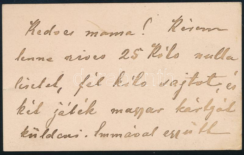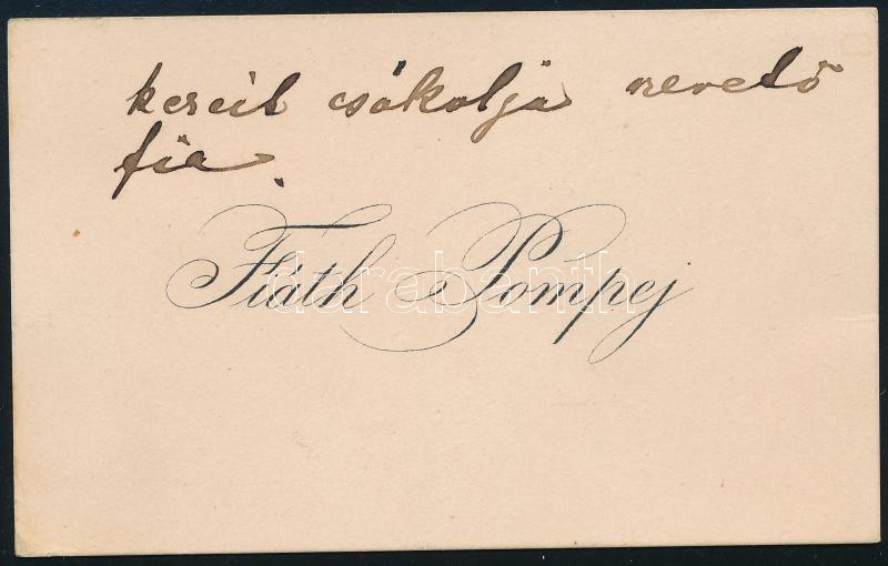 cca 1880 Eörményesi és karánsebesi Fiáth Pompej (1862-1909), Gyulassy Emma (1867-1930) férjének névjegykártyája, rajta: "Kedves mama! Kérem lenne szíves 25 kilo nulla lisztet, fél kilo sajtot és két játék magyar kártyát küldeni. Emmával kezeit csókolja szerető fia."