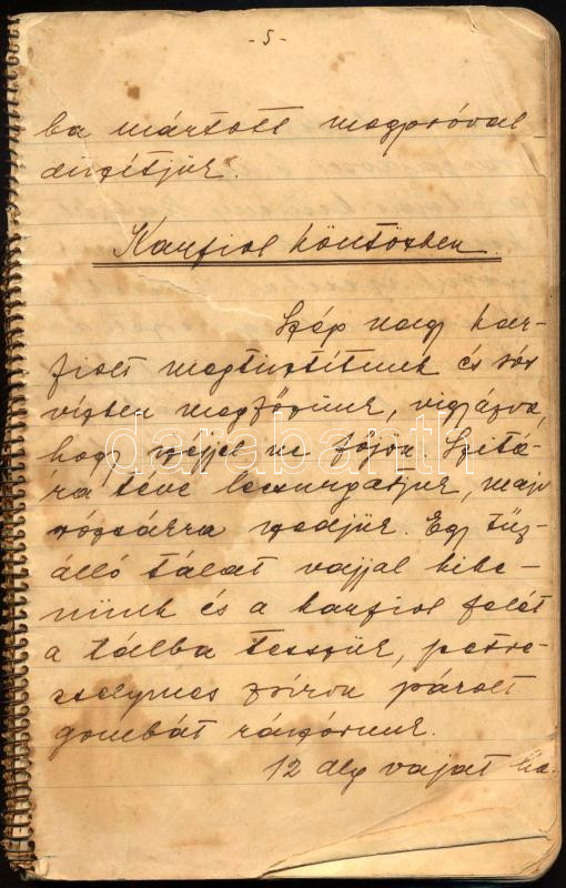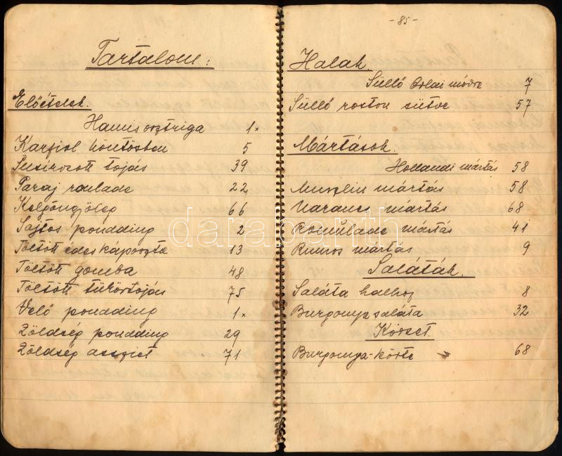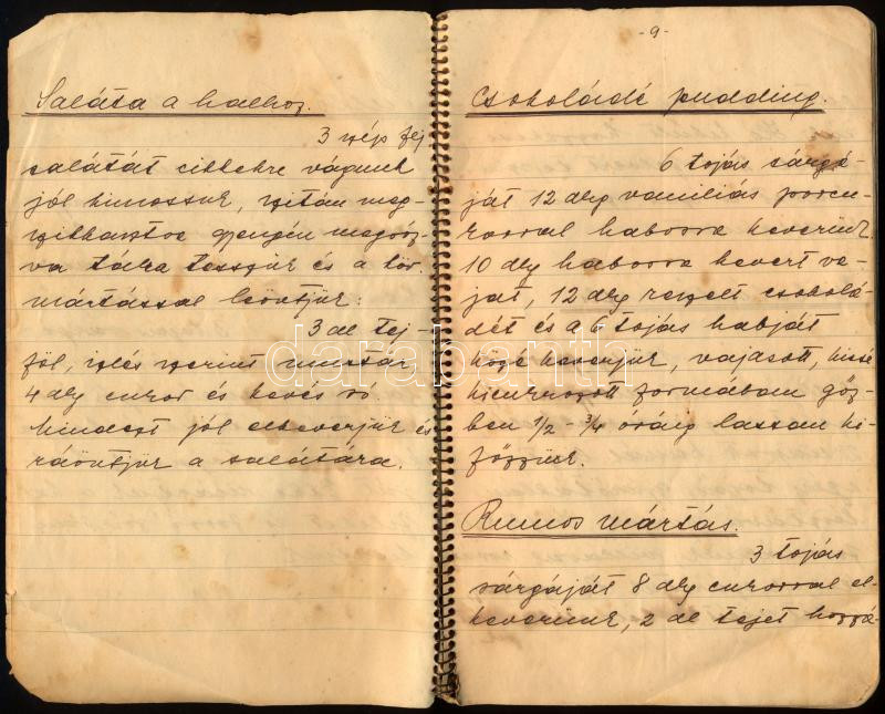 cca 1936 Kézzel Ãrt receptfüzet, benne "Karfiol köntösben", "Töltött édes káposzta", "Gesztenye-alagút", stb. (a receptek mellett leÃrja a hozzávalók költségét is), összesen kb. 80 beÃrt oldal, helyenként foltos, sérült lapokkal