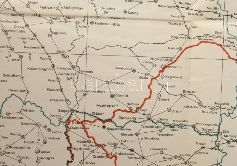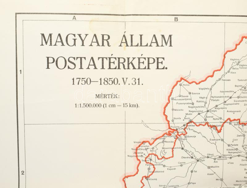 1943 Magyar állam postatérképe 1750-1850 (rajta jelölve az 1942-ig visszacsatolt területek is), 1 : 1.500.000, M. Kir. Honvéd Térképészeti Intézet, néhány kisebb folttal, 51,5x72,5 cm
