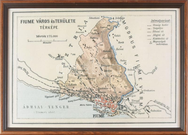 Fiume város és területe térképe, 1:75.000, modern nyomtatvány, üvegezett fakeretben, 22x31 cm