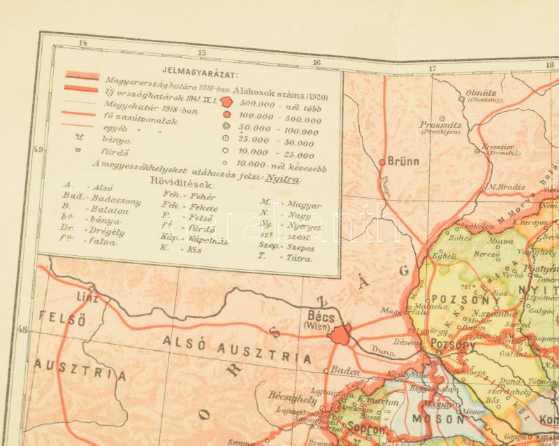 1943-ban kiadott közigazgatási térképünk a teljes történelmi Magyarországot ábrázolja; az 1938-as, 1939-es, 1940-es és 1941-es diplomáciai és katonai műveletek nyomán létrejött új határvonal feltüntetésével. A domborzati, vízrajzi, településhálózati és közlekedésföldrajzi részleteken kívül érdekes részlet, hogy lapunk az 1918-ig érvényes megyebeosztást tartalmazza. A geopolitikai helyzetnek megfelelően nyugati és északi szomszédunk Németország, keleten Románia látható (a bukovinai székely települések esetén magyar megnevezésekkel), délen Szerbia, Bosznia és Horvátország államai. Szlovénia helyén Krajna tartomány, az olasz törekvéseknek megfelelően Dalmácia olasz ellenőrzés alatt. A jobb felső sarokban Budapest melléktérképe. Térképlapunkon halvány elszíneződés, a hajtások mentén apró szakadásnyomok, hátoldalán kisebb foltosság és kézi számolás.