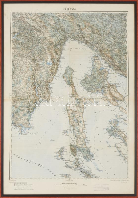 cca 1920 Pola, Fiume és környéke térképe, 1:200.000, Militärgeographisches Institut, "modern üvegezett fa keretben, 64x45 cm, keret: 66x47 cm