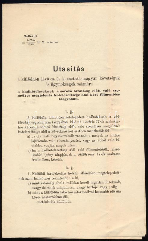 1874 Utasítás a külföldön lévő cs. és k. osztrák-magyar követségek és ügynökségek számára a hadköteleseknek a sorozó bizottság előtt való személyes megjelenés kötelezettsége alól kért fölmentése tárgyában