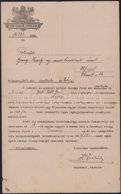 1912 Temesvári Hadapródiskola felvételi értesítője