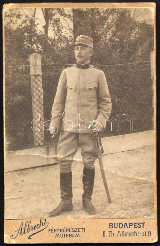 1915 Katonaportré, keményhátú fotó Albrecht budapesti műterméből, szecessziós hátoldallal, felületén törésnyom, 16,5×10,5 cm