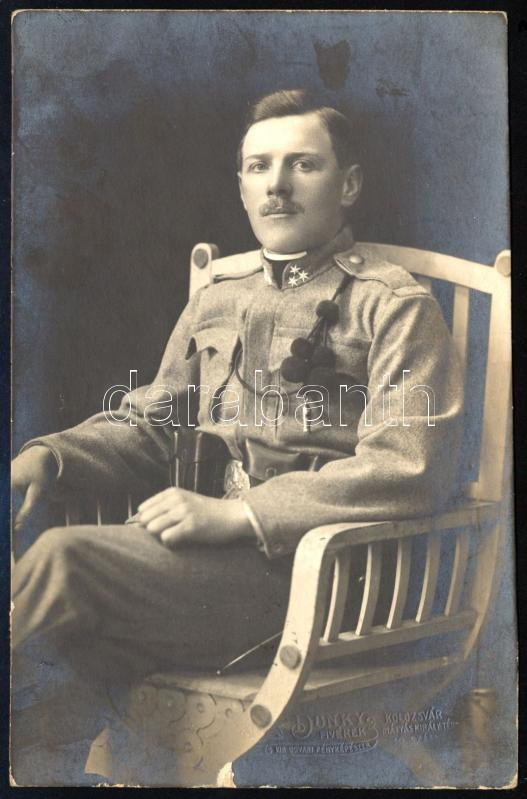 1915 Magyar katonatiszt lövészbojttal, fotólap a Dunky fivérek kolozsvári műterméből, megírt és futott, 13,5x8,5 cm