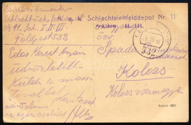1918 Tábori vágómarha-telep tisztjének (Szártori őrmester) portréja, fotólap, megírva és tábori postaként elküldve, "K. u. k. Schlachtviehfelddepot Nr. 11" bélyegzéssel, 14x9 cm