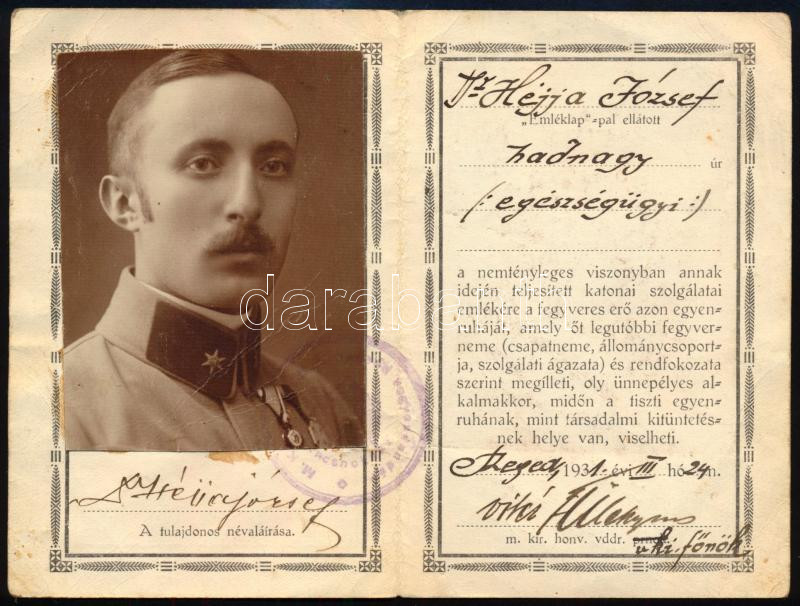1931 Szeged, Héjja József nevére kiállított fényképes emléklap egyenruha-viseléssel kapcsolatban