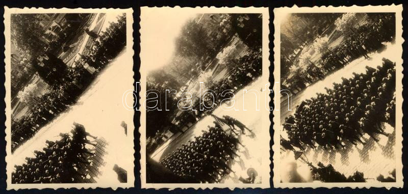 1938 Magyar katonák bevonulása Kassára (Felvidék), 3 db fotó, 5,5×8 cm