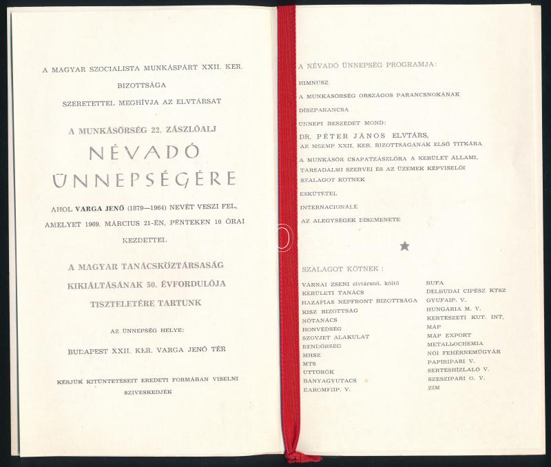 1969 Meghívó a Munkásőrség 22. zászlóalj névadó ünnepségére, a borítón fém plakettel