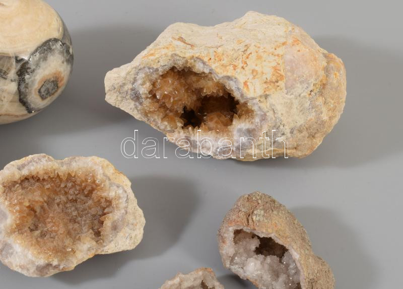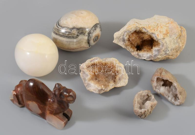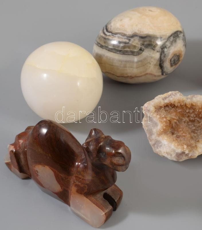 Kis doboznyi ásvány tétel, faragott teve, ásvány tojás, geodák.