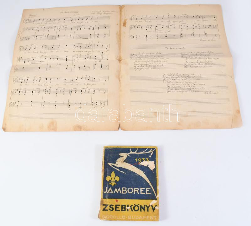 1933 Jamboree zsebkönyv, Gödöllő-Budapest, kiadja: IV. Világjamboree-Táborparancsnokság, ragasztott térképmelléklettel, 127p + Cserkészinduló kézzel írt kotta.