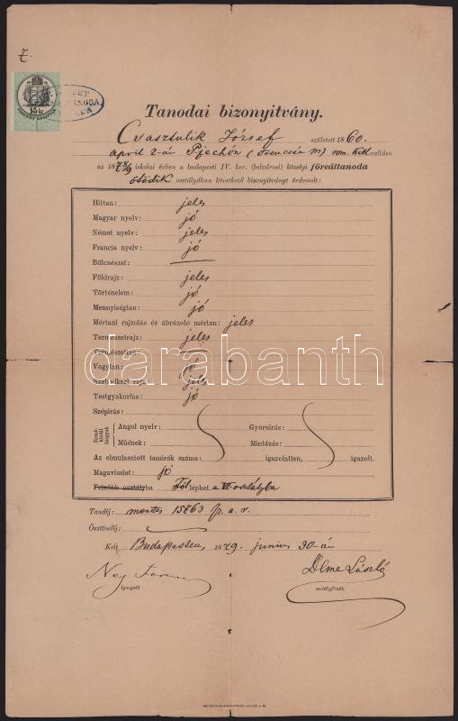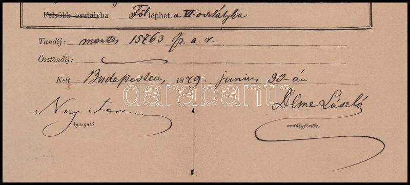 1880 Pilisi Ney Ferenc (1814-1889.) hírlapíró, színműíró, a pesti belvárosi reáliskola igazgatója autográf aláírása bizonyítványon