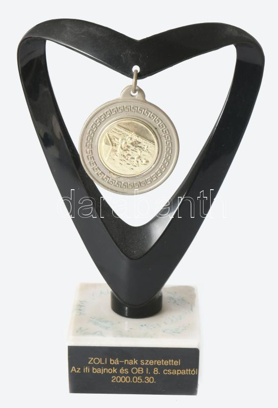 2000 Az Ifjúsági vÃzilabda bajnok csapat tagjainak a KSI csapat tagjai által aláÃrt dÃj. Dömötör Zoltán (1935-2019) olimpiai bajnok vÃzilabdázó, úszó, edzÅ‘ részére dedikálva Márvány alapon. Varga Dénes, Varga Dániel, Hosnáynszky Róbert, SzÃvós Márton, Gór Nagy Miklós, stb. 16 cm