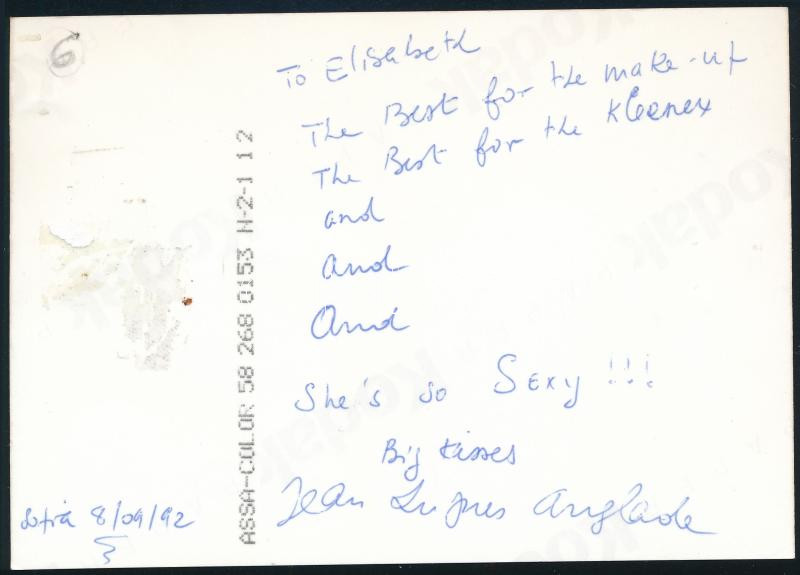 Jean-Hugues Anglade (1955-) francia színész, filmrendező autográf aláírása és sorai őt ábrázoló fotón, 9x12,5 cm / Autograph signed photo of Jean-Hugues Anglade (1955-) French actor and film director