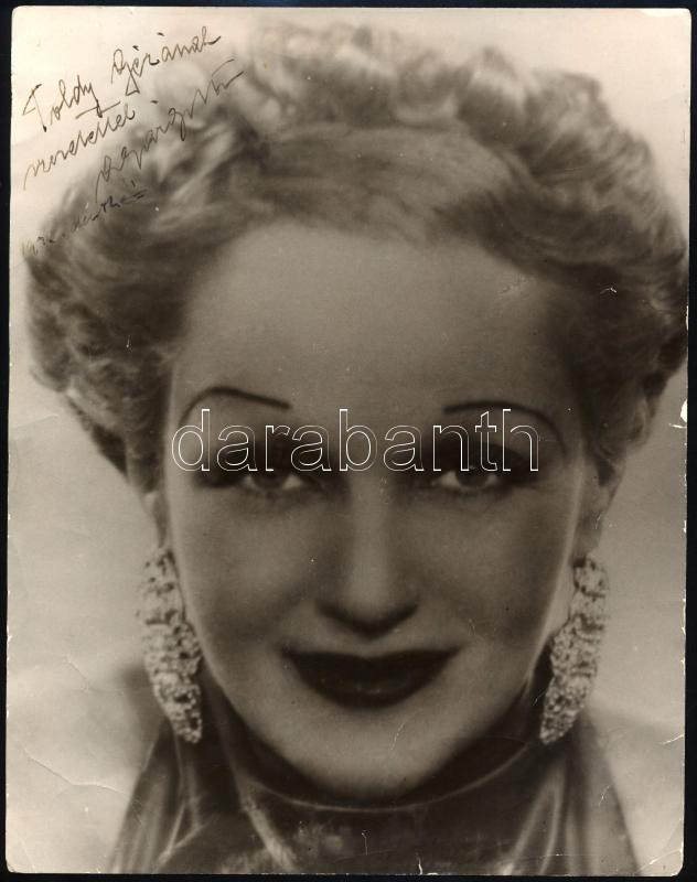 Rökk Marika (1913-2004) színésznő, táncosnő, operettprimadonna dedikált fotója Toldi (Tunigold) Géza (1909-1985) válogatott labdarúgó részére (testvére, Rökk Ede (1911-1990) a válogatottban Toldi csapattársa volt), szélén kis sérülésekkel, törésnyomokkal, 25x20 cm