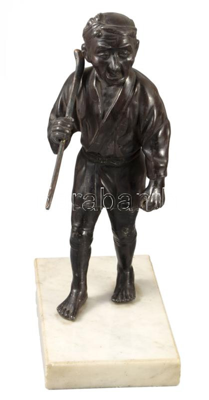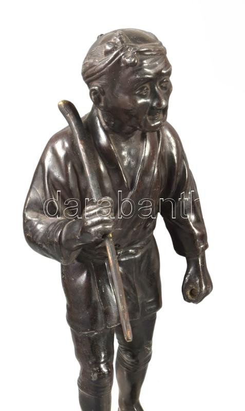 Antik bronzírozott fém kínai farmer figura, talapzaton, hiánnyal, m: 22,5 cm