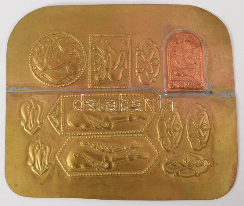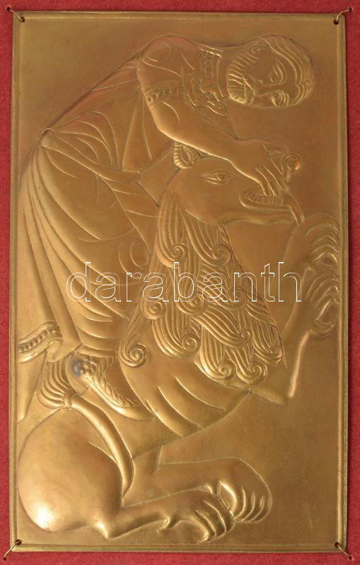 Barna Borbála: Sámson harca az oroszlánnal. Somogyvári bazilika domborművének másolata Réz, 17x10 cm + ősmagyar motívumok, rézlemezen 15x19 cm