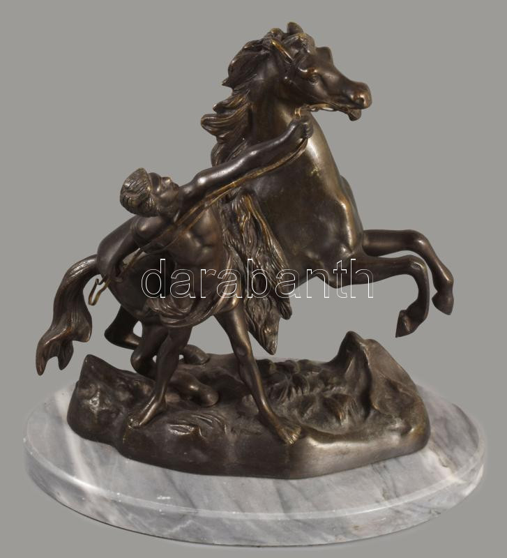 Ismeretlen szobrász: Lovát fékező lovas. Patinázott bronz, márvány talapzaton, cca 1900, m: 26 cm