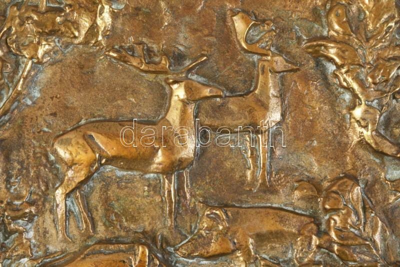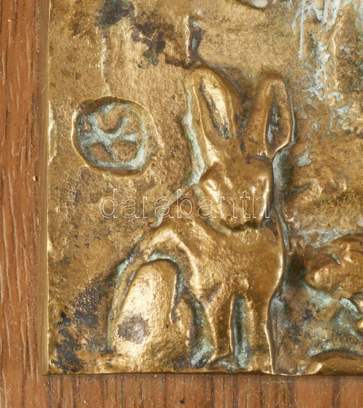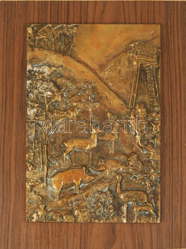 Szentirmai Zoltán (1941-): Erdei állatok a vádászlesnél. Bronz plasztika, fa lapon, jelzett, 29x19 cm, 36x27 cm