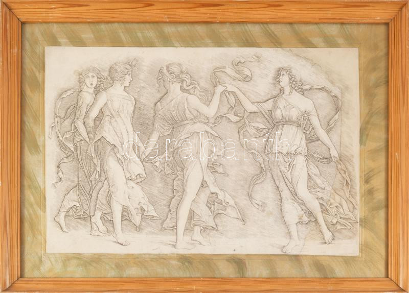 Andrea Mantegna (1431 k.-1506) után: Négy múzsa. Jelzés nélkül, restaurált, üvegezett fakeretben, 23x35 cm, külső méret: 32x44,5 cm